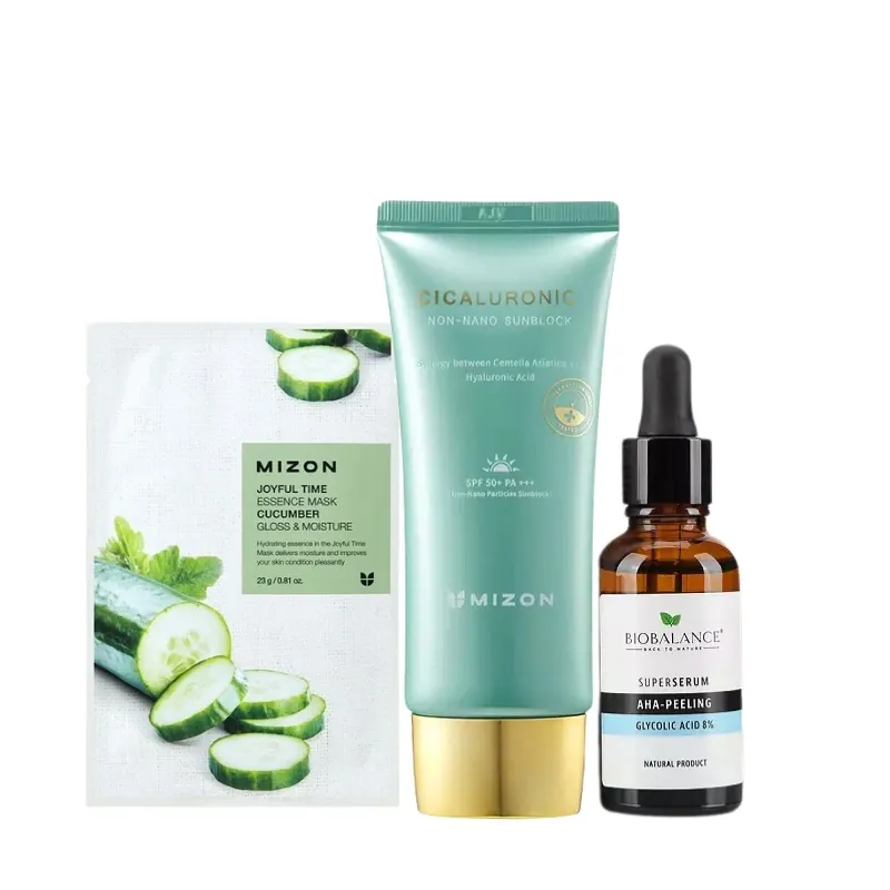 روتين متكامل لتقشير البشرة، توحيد لونها، ترطيبها وحمايتها، يجمع بين سيروم فعال، ماسك منعش وواقي شمس مغذي.