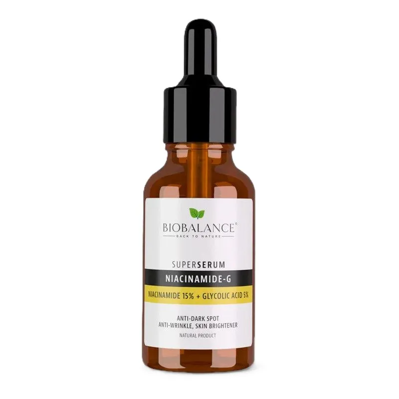 سيروم BIO BALANCE Super Serum Niacinamide-G هو تركيبة مركزة تحتوي على نسبة عالية من النياسيناميد، المعروف بفوائده في تحسين ملمس البشرة وتنظيم إفراز الزيوت وتقليل مظهر المسام الواسعة. يساعد هذا السيروم على تنعيم البشرة، توحيد لونها، وتقليل الخطوط الدقيقة والتجاعيد البسيطة، ليمنح الوجه مظهرًا صحيًا ومشرقًا. مناسب لجميع أنواع البشرة بما في ذلك الحساسة، ويتميز بتركيبته الخفيفة التي تمتصها البشرة بسرعة دون ترك أثر دهني.
