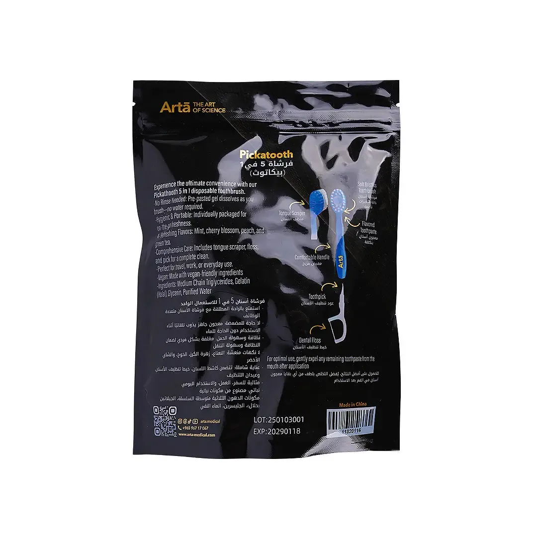 آرتا بيكاتوث 5 في 1 هي أداة مبتكرة للعناية بالفم مصممة لتمنحك تنظيفًا سريعًا وفعالًا في أي وقت وأي مكان، دون الحاجة إلى ماء أو معجون منفصل. تجمع كل قطعة بين خمس وظائف أساسية في تصميم صغير وعملي، مما يجعلها خيارًا مثاليًا أثناء السفر، في العمل، أو أثناء التنقل. تأتي بنكهات منعشة ومتنوعة مثل النعناع، الكرز، الخوخ، والشاي الأخضر لتمنحك إحساسًا دائمًا بالانتعاش.