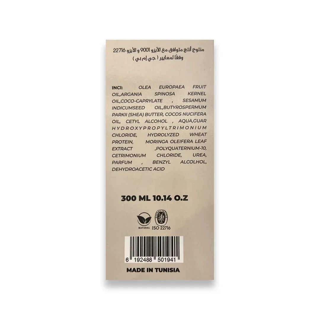 Wheat proteins help strengthen the hair structure and reduce breakage and split ends. Argan oil provides deep hydration and natural shine, while moringa extract protects the hair from environmental damage and nourishes the scalp for healthier hair growth. Suitable for all hair types, it leaves hair soft, smooth, and easy to manage with a refreshed look.