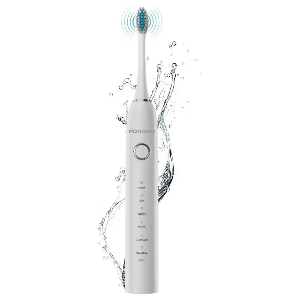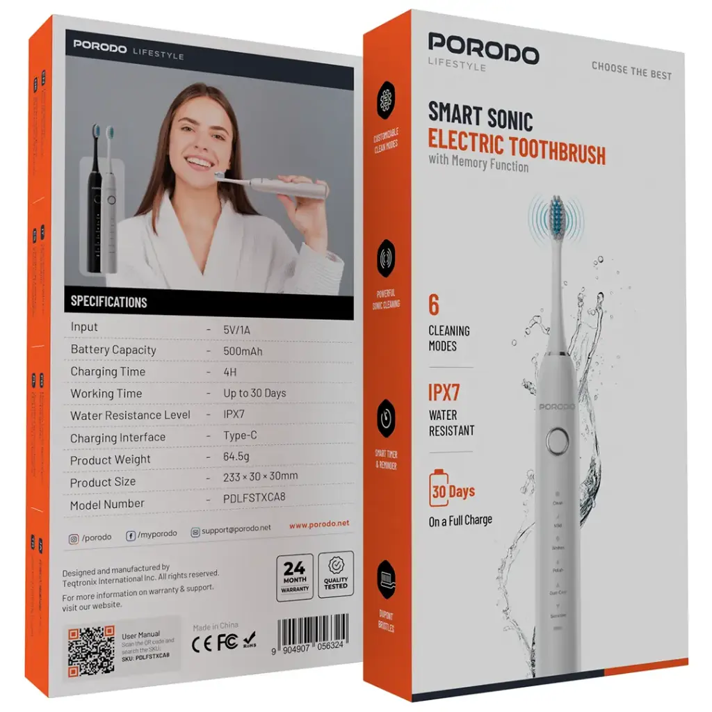 The Porodo Smart Electric Toothbrush is designed to provide an advanced and effective cleaning experience to maintain optimal oral health. It combines powerful performance with smart technology, offering multiple cleaning modes to suit different needs—from gentle cleaning for sensitive teeth to deep cleaning for effective plaque removal.