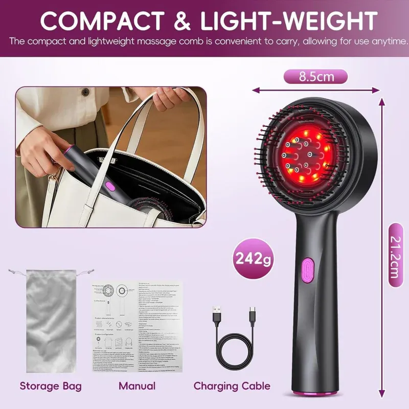A scalp massaging brush with an oil applicator designed to provide a complete scalp and hair care experience. It uses high-frequency vibration technology with three different massage modes and flexible comb teeth that adapt to the shape of the scalp for a comfortable and effective massage. The built-in serum chamber allows easy application of oils or serums while combing, helping nourish the scalp and distribute the product evenly. It also features red and blue light therapy to stimulate the scalp and improve nutrient absorption. The device has a portable design with fast Type-C charging, taking about one hour to fully charge and providing up to 10 days of use. It also includes an automatic shut-off after 10 minutes to protect the device.