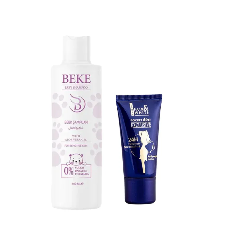 This complete daily care set includes Beke Zero Sulfate Shampoo for Kids 400ml and Whitening Roll-On Deodorant 50ml, providing a safe and effective routine for hair care and underarm protection.